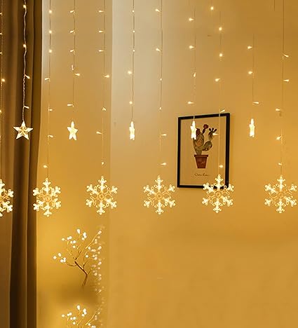 GLOWAURA Snowflake LED String Curtain Lights – Decorative Snowflake & Star Lights for Holidays, Parties & Room Décor (1 Set: 6 Snowflakes + 6 Stars)